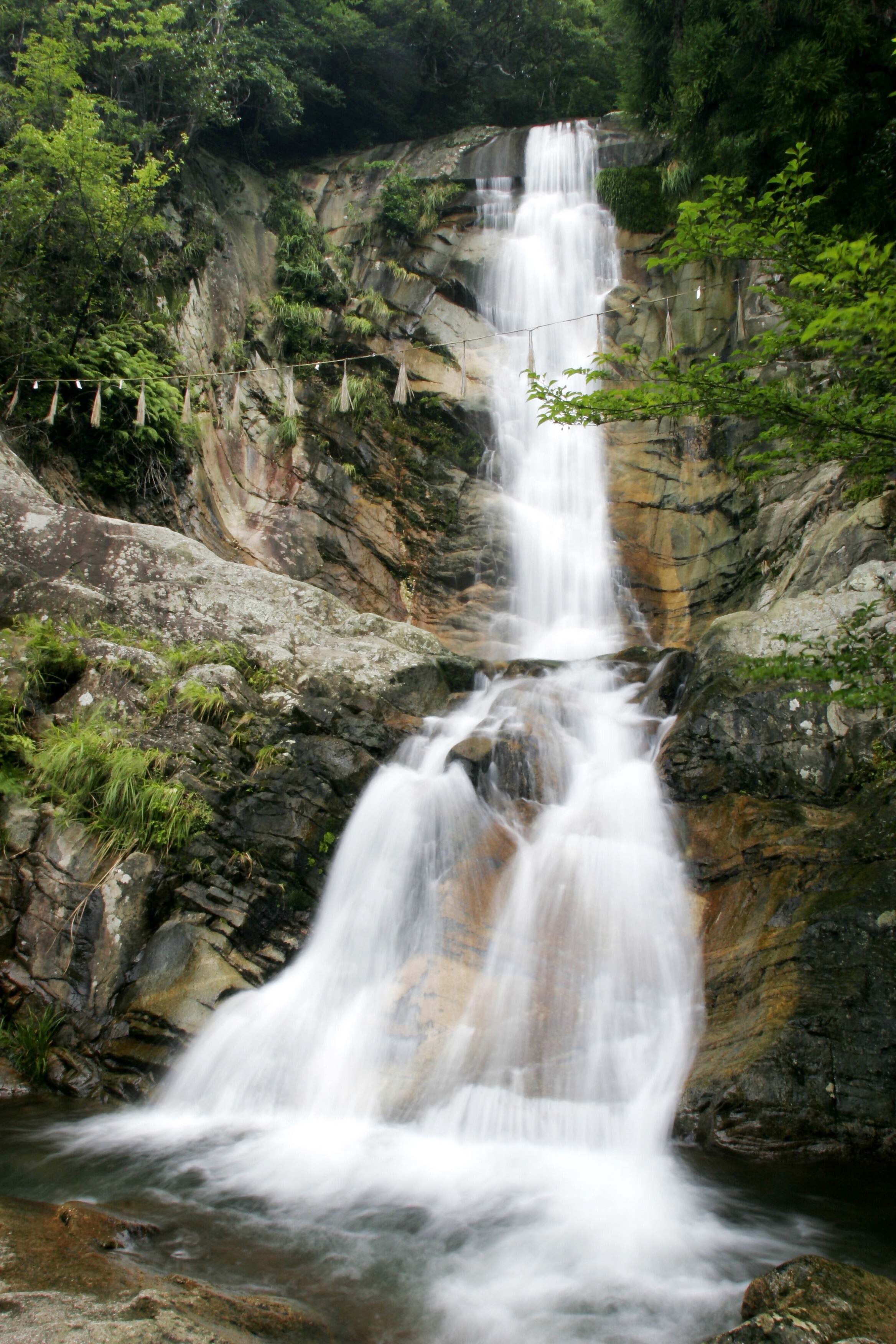 北九州国定公園内の上野峡にある落差25メートルの滝です。水しぶきを上げて一気に落ちる景色は見飽きることがありません。夏には涼を求めて多くの人が訪れます。かつて松尾芭蕉の門人で芭蕉十哲の一人に数えられる俳人・志太野坡が、天保13年(1728)に門人とこの地を訪れ、その清遊の様子を野坡の門人で多賀神社宮司の青山文雄が『折躑躅』という書にまとめています。