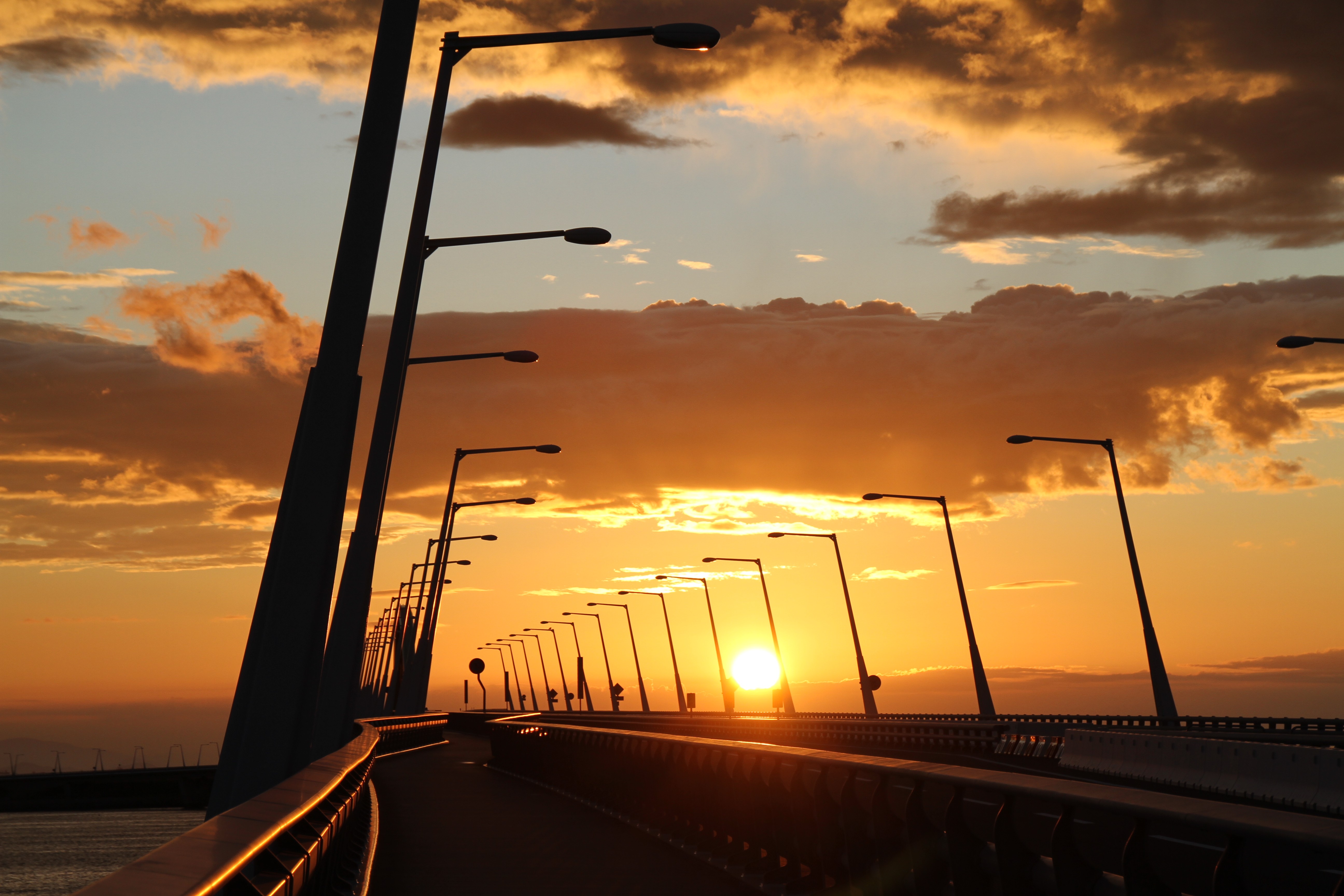 九州で最も長い2,100mの橋です。海の上を一直線に伸びる橋に歩道が設けられ、自転車や徒歩でも空中散歩を楽しむことのできるスポットです。テレビCMにもよく使われています。