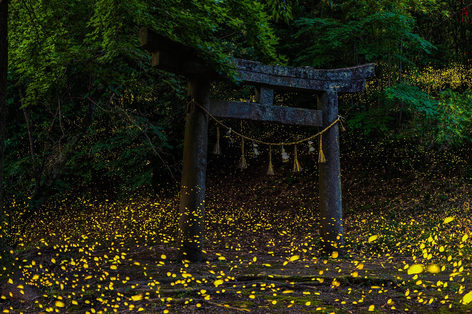 八剱神社は鞍手町の南東にそびえる標高125mの劔岳南東、鞍手インターチェンジから車で数分の位置にあり、その歴史は古く、足利尊氏との関連がある神社として知られています。劔岳東側斜面に生息しているヒメボタルは、毎年5月下旬から6月上旬にかけて、およそ20時から21時頃に出現し、この時期は多くの見学者で賑わいます。細かく明滅するホタルの光は、周囲の幻想的な雰囲気と相まって見る者を魅了します。
