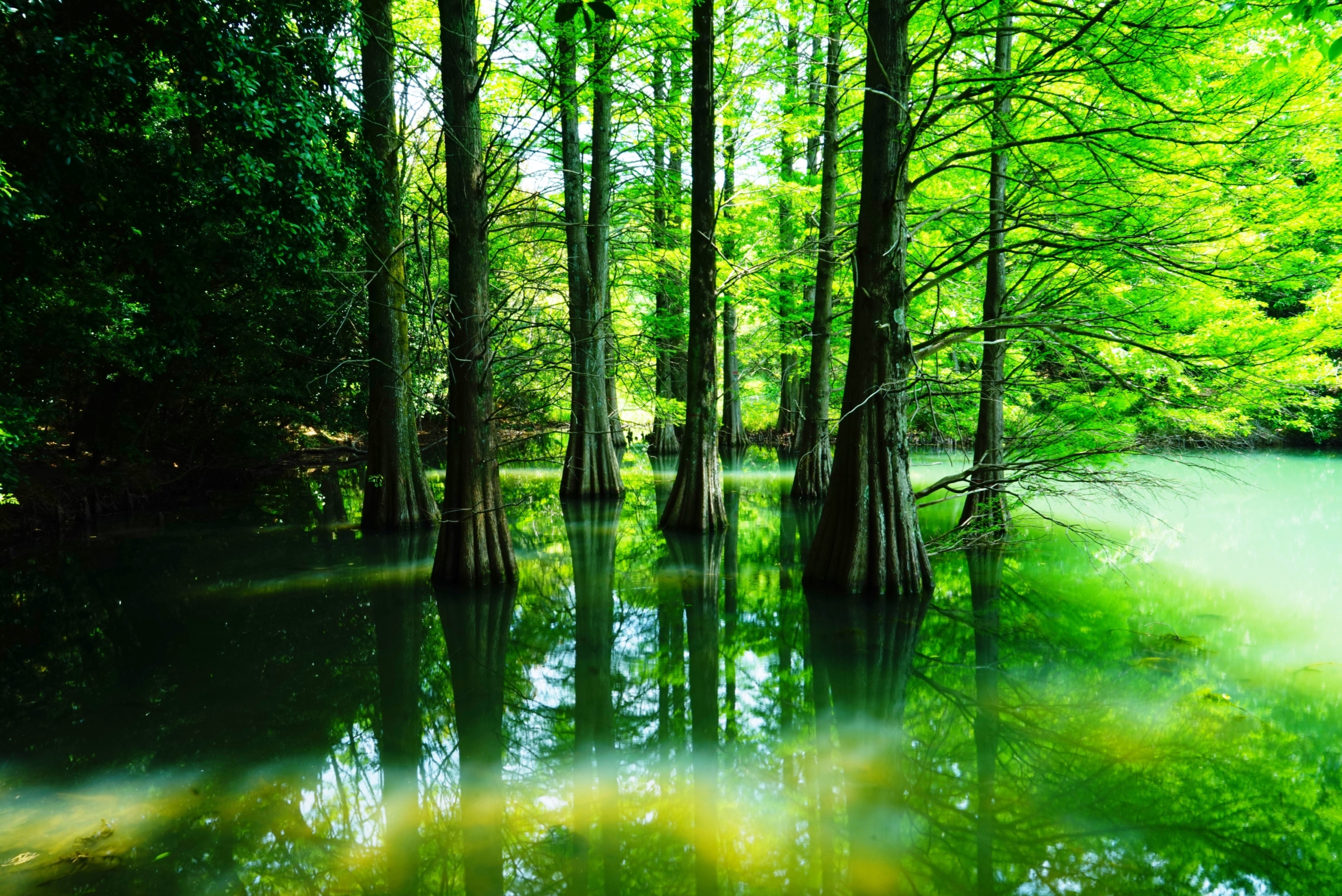 森の中心にある蒲田池の周りには一周約2キロメートルの遊歩道があります。森林セラピーロードのひとつにも認定されており、自然を感じながら歩くことができます。遊歩道の途中にあるベンチやあずまやでは、自然を満喫しながらゆったりとした時間を過ごすことができます。